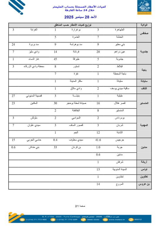 وفيما يلي كميات الأمطار المسجلة بحساب المليمتر بعدد من الولايات: